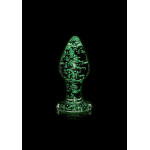 Pluggen er smal i tuppen og blir gradvis bredere, før den svinger inn igjen til en smal hals og ender i en rund stopper. Glassmaterialet er dandert med små dråper med en frekk glow in the dark effekt.