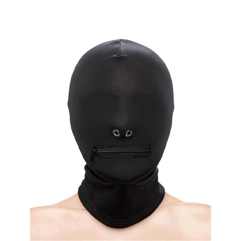 Ta kontroll over din underdanige med denne frekke bondage masken! Denne pirrende masken er laget av myk og tettsittende nylon, kombinert med nikkelfritt metall for en sikker og komfortabel opplevelse. Masken dekker øynene og har en åpning for munnen som kan lukkes med glidelås, noe som gir en ekstra spennende dimensjon av kontroll.