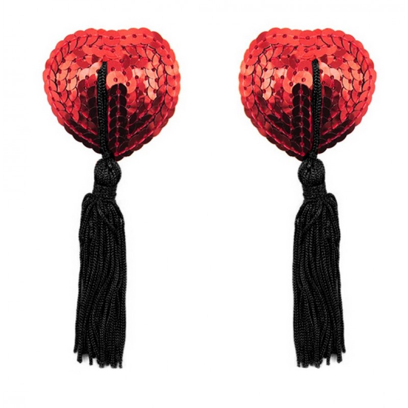 Forførende nippletassels med røde paljetter og sort dusk. Kommer med selvklebende tape, slik at de er enkle å ta av og på.