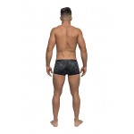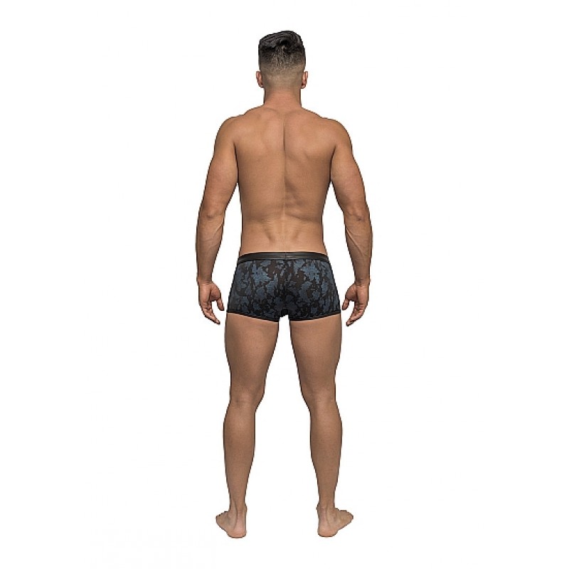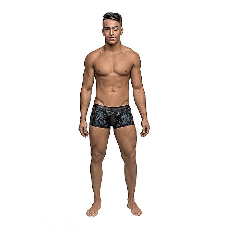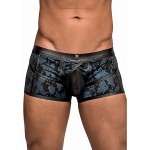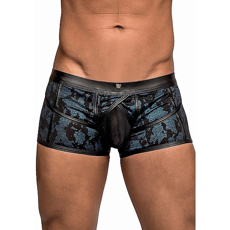 Frekk boxer til han med lærdetaljer, gjennomsiktig nettingpose og glinsende stoff.