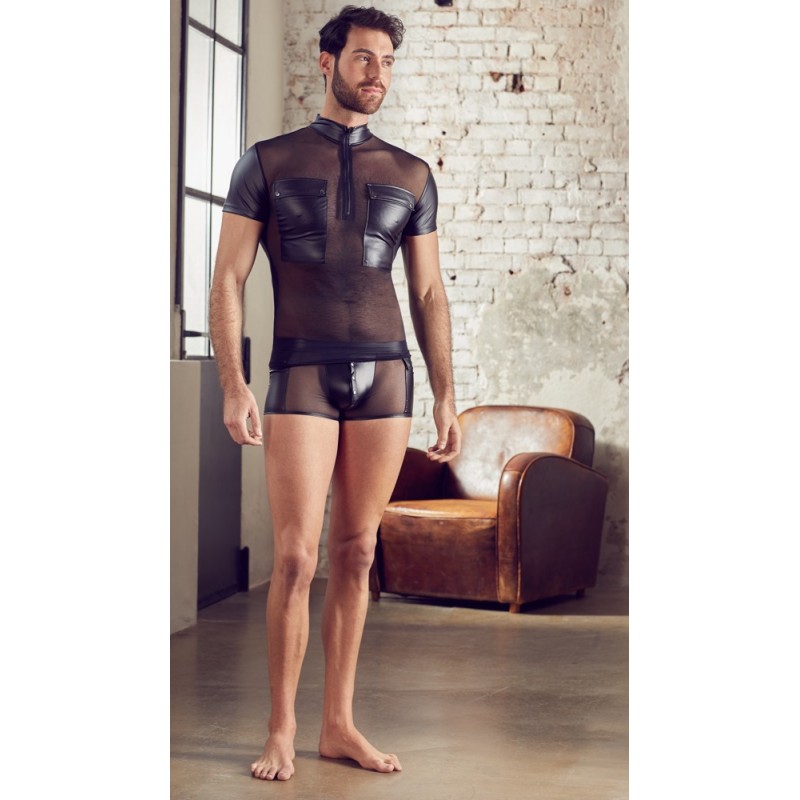 Overrask hjemme med denne frekke skjorten! Skjorten er todelt med et dristig powernet foran, og et maskulint lakk-look på baksiden som fremhever ryggmusklene.