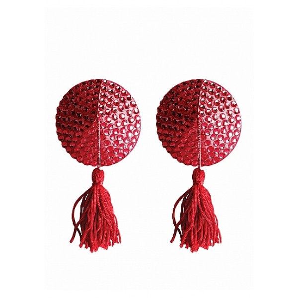 Forførende nipple tassels med glitrende stener og rød dusk.