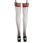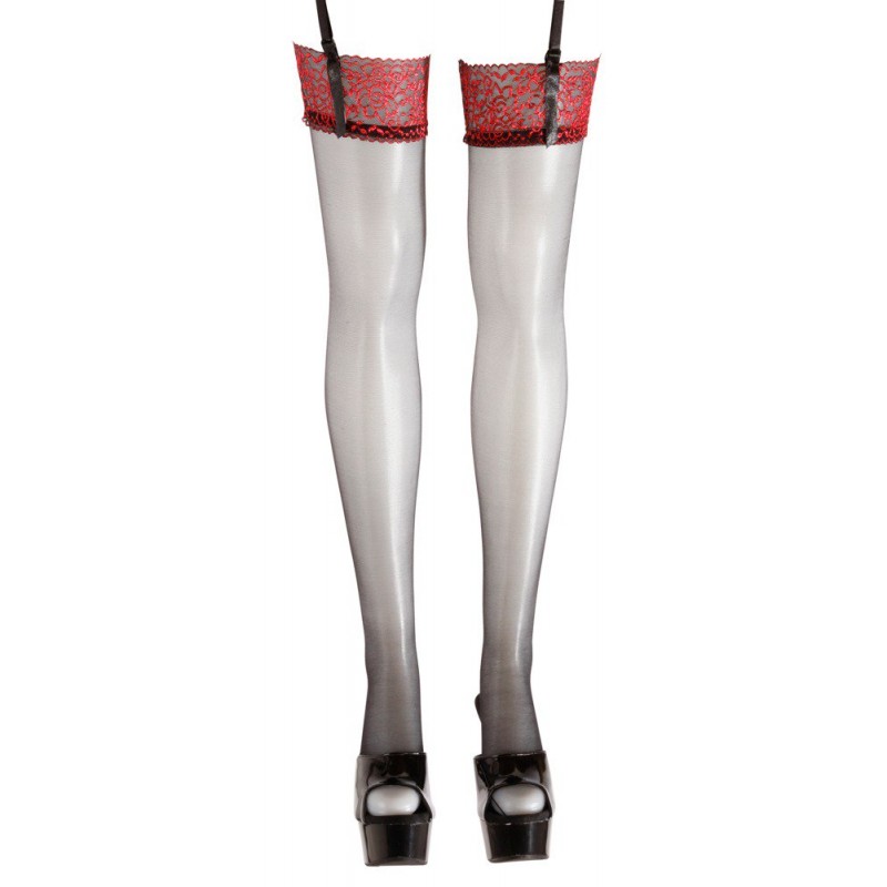 Sorte, gjennomsiktige strømper med mørkerød blondekant. Disse strømpene fester du ved hjelp av en hofteholder. Det perfekte tilbehøret til en het kveld!